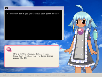 A short kinetic novel centring a conversation between an ukagaka and her programmer about a strange dream, advancements in AI and what it means to be human.